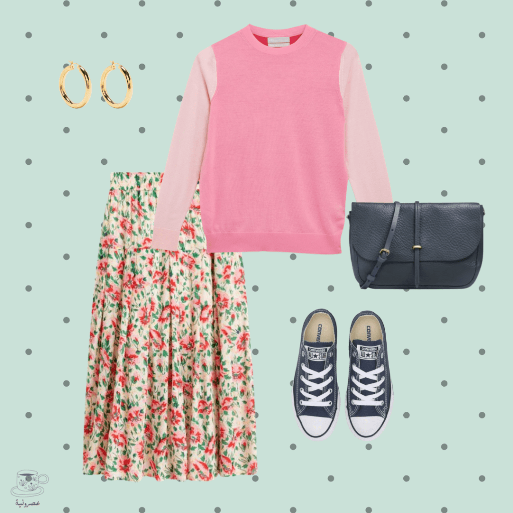 ٣.  تنورة قطنية بزخارف صيفية مبهجة+ كنزة بأكمام طويلة+ حذاء كونفرس+أقراط ذهبية على شكل حلقات مجوفة+ حقيبة جلد مائلة.