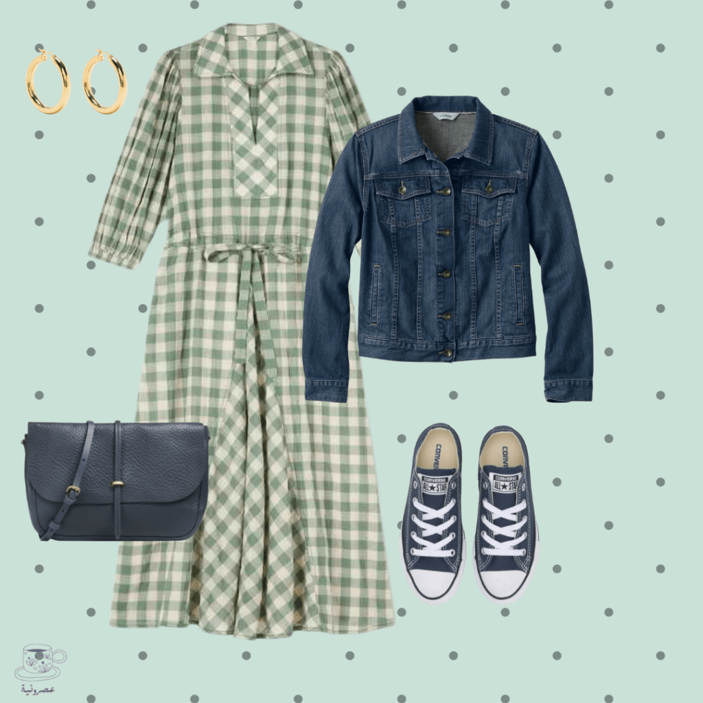 ١. فستان صيفي ذو ألوان مبهجة + جاكيت جينز+ حذاء كونفرس +أقراط ذهبية على شكل حلقات مجوفة+ حقيبة جلد مائلة.