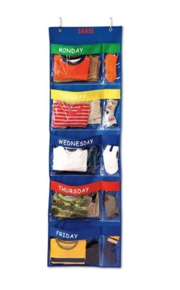 لقد ذكرت في مباهج طفولية للشهر الماضي بأنني اقتنيت ملابس المدرسة بعدد أيام الإسبوع، وكيف أسهم ذلك في تسهيل العديد من المهام. وبعده قررت أن اقتني منظم للملابس لأعلقه خلف الباب ويحتوي على ٥ جيوب، في كل جيب أضع ملابس المدرسة وملابس داخلية وشراب. تستطيعون أن توكلون هذه المهمة للأطفال، ففي كل يوم سبت تكون الملابس نظيفة ومكوية وكل ما عليهم هو تنظيمها داخل الجيوب.