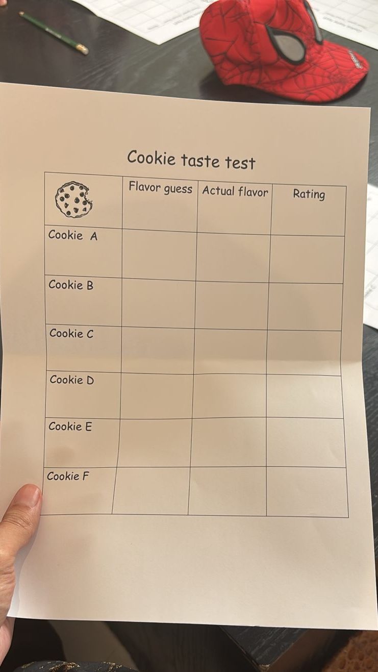 طرأت لي فكرة قبل أن نذهب وهي أن نشتري مجموعة من الأنواع المتوفرة (اخترنا ٤ أو ٥ فقط) وسأصمم ورقة تقييم بسيطة للأطفال ليقيمون كل واحدة، وضعت خانة لكل كوكيز ثم بجانبها وضعت مالنكهة التي يتوقعونها (بعد أن قرأنا عليهم جميع النكهات من قائمة المطعم) ثم تقيميهم للكوكيز من ١٠ وآخر خانة مالنكهة الفعلية للكويكز بعد أن نخبرهم.